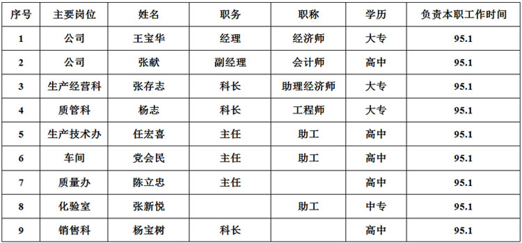 唐山华昌医用卫生敷料实业有限公司主要岗位人员一览表